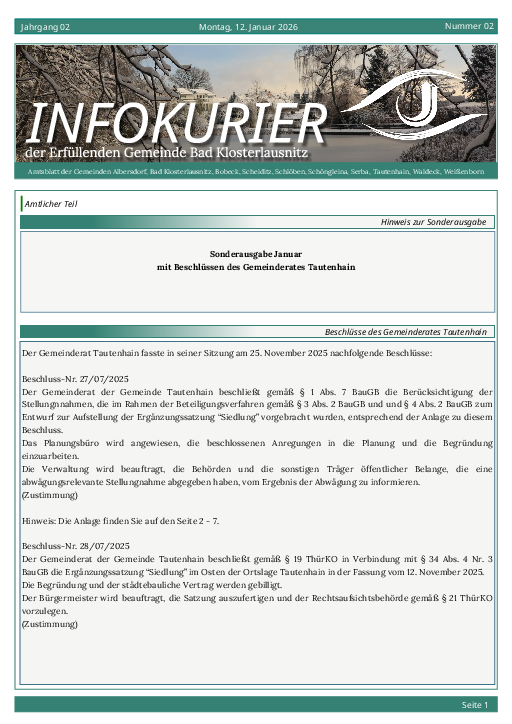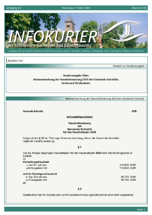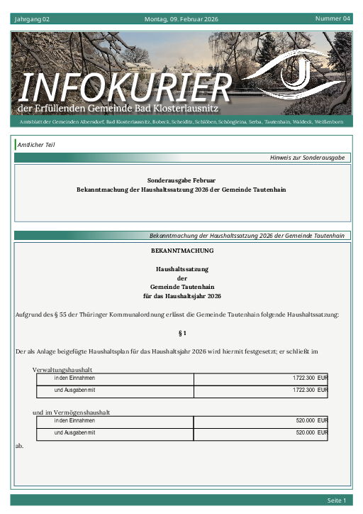 Im Amtsblatt der Erfüllenden Gemeinde Bad Klosterlausnitz informieren wir Sie regelmäßig über offizielle Bekanntmachungen, Ausschreibungen und rechtlich relevanten Veröffentlichungen in digitaler Form. Das Amtsblatt erscheint ausschließlich als elektronische Ausgabe und steht Ihnen hier jederzeit komfortabel als PDF-Download zur Verfügung.